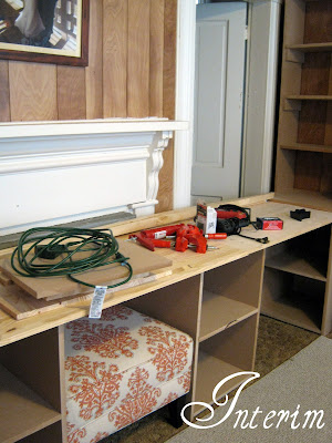 We're waiting for a pretty day outside now so we can cut all the 1x2 trim for the bottoms, paint the base units white and stain the top. I'm thinking a nice warm natural cherry colour, followed by some satin polyurethane. According to weather.com that won't be happening until Thursday. And that ottoman? We picked that up at the Habitat For Humanity Restore for $20!! It's a Pottery Barn Ottoman!! I adore it!!